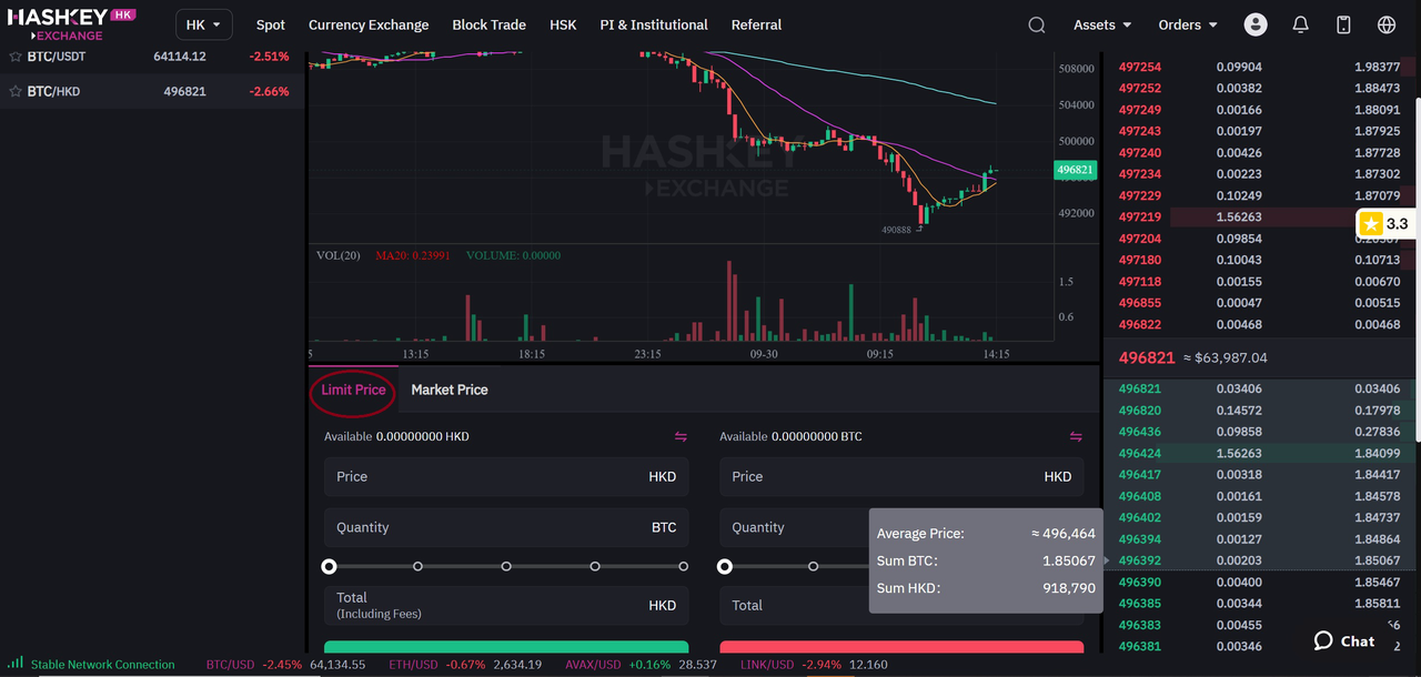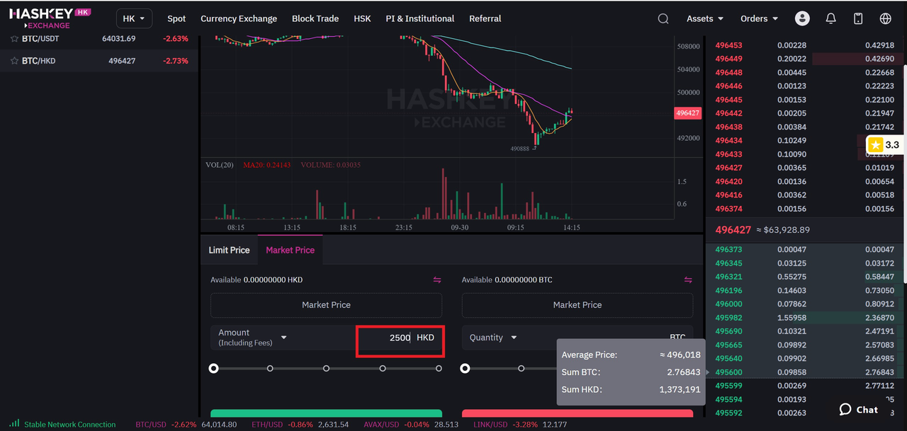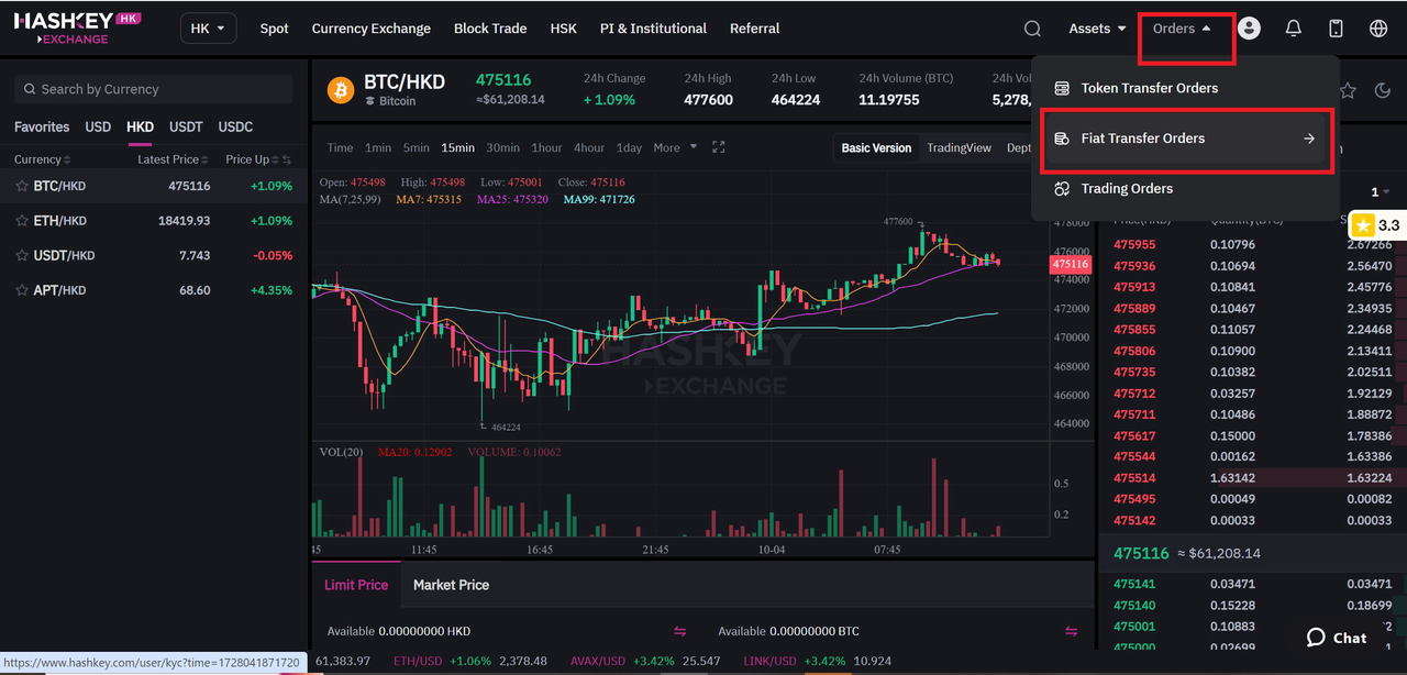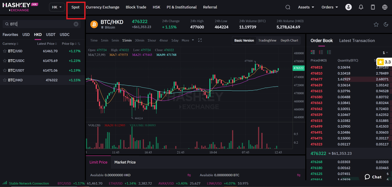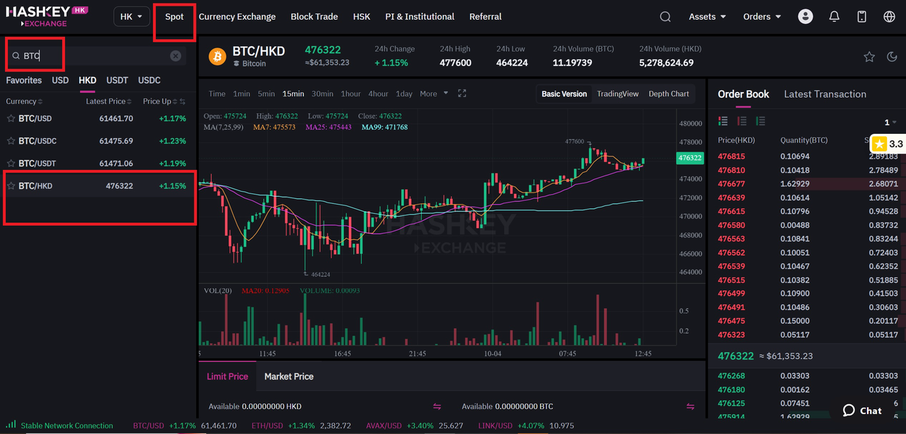 With your fiat funds (HKD) now in your funding account. After transferring to your trading account, you can proceed to buy Bitcoin. Follow these steps: