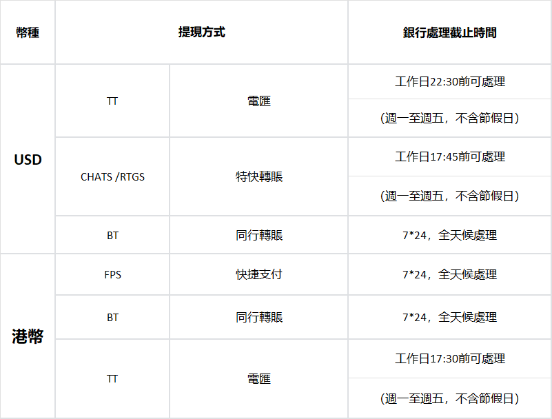 HashKey Exchange將在接收到您的提現請求後,立即着手處理。但請注意,由於提現流程需要銀行端的配合,這一過程可能並不完全在我們的掌控之中,因此可能會存在一定的延遲。最終的到賬時間將依據您所在銀行的處理速度而定。爲了給您提供參考,我們提供了銀行端處理時間的預估表。如果您在法幣充值或提現過程中遇到任何疑問或問題,請隨時通過我們的客戶服務郵箱([email protected])與我們聯繫。