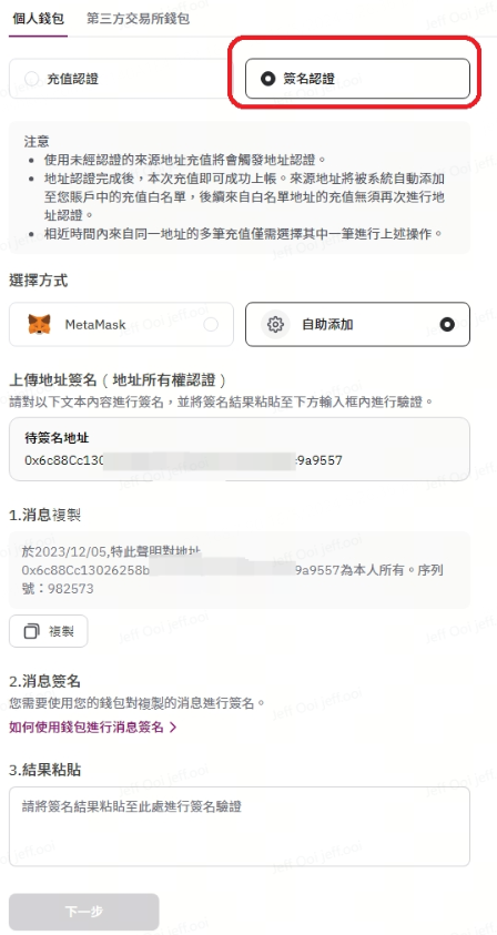 上述步驟概述了個人錢包的標準“小額支付驗證”儲值流程。如果您繞過白名單驗證,不使用“小額支付驗證”流程,您的個人錢包儲值將不會自動入賬,並將保持“等待地址驗證”狀態。您可以通過導航至“託管賬戶”→“賬戶記錄”來查看和驗證儲值。除了“小額支付驗證”方法外,您還可以選擇“簽名驗證”方法進行驗證。如果您不知如何操作簽名認證,建議您直接向錢包供應商的客服查詢。